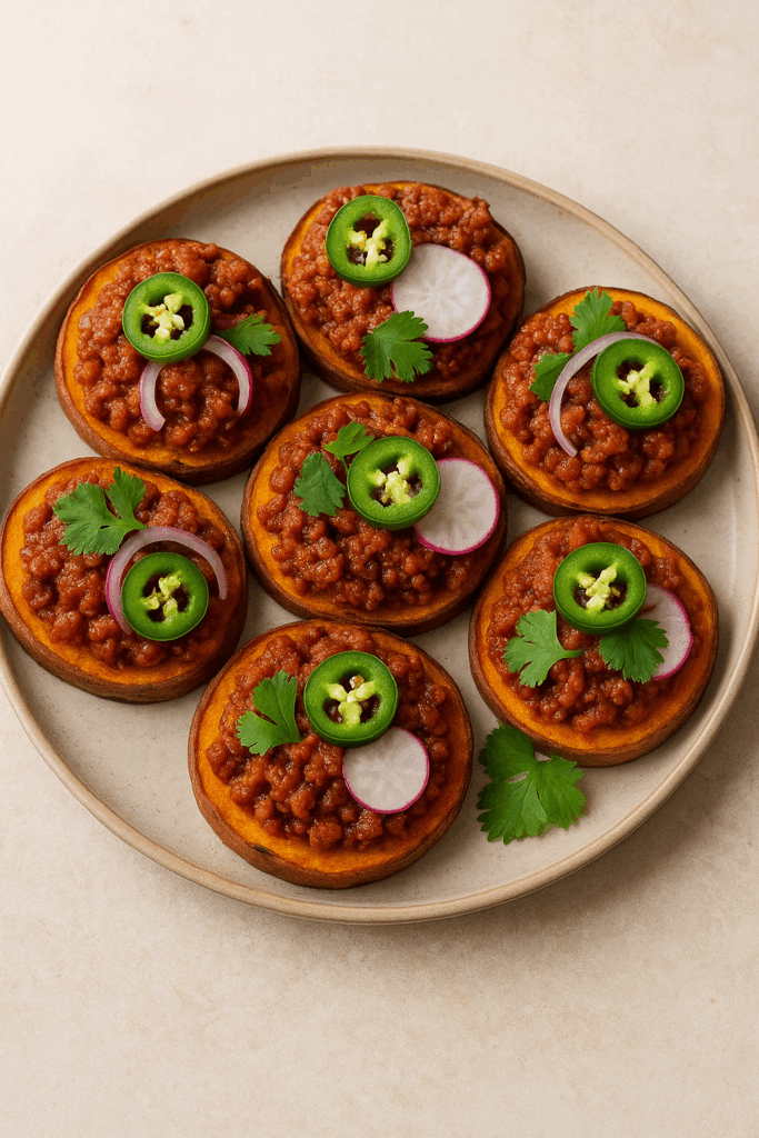 Taste and season with a little more salt if needed. Serve over the roasted sweet potato rounds topped with jalapeño, red onion, cilantro, and radishes.